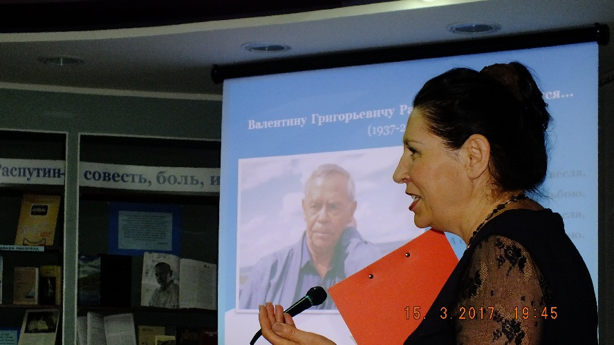В Центральной городской библиотеке для учащихся общеобразовательных школ города была проведена читательская конференция «Дом. Семья. Земля – основа человеческой жизни», на которой прошло обсуждение рассказа В. Распутина «В ту же землю». Открыл конференцию рассказ о Валентине Распутине. Присутствующим напомнили некоторые факты из биографии знаменитого автора, продемонстрировали фрагмент из документального фильма «Душа хранит», в котором Валентин Григорьевич говорит о проблемах, перекликающихся с темой конференции. Специально для мероприятия была подготовлена выставка «Валентин Распутин – совесть, боль и правда народная», на которой представлены автобиографические материалы, сборники произведений, публицистика, воспоминания близких и друзей. Также в Центральной городской библиотеке в рамках цикла встреч «Закрытый показ» прошел «литературный суд» «По законам народной совести» по повести В. Распутина «Живи и помни». Вниманию присутствующих были предложены фрагменты фильма с одноименным названием. После просмотра участники суда разделились на две группы: защитники и обвинители. Перед ними стоял один вопрос: можно ли понять и простить измену? Для участников читательской конференции и литературного суда были подготовлены книжные выставки «Писатель, гражданин, романтик, публицист» и «Из личной библиотеки писателя», посвященные жизни и творчеству Валентина Григорьевича Распутина. В честь юбилея великого сибирского писателя в Центральной детской библиотеке состоялся литературный диспут «Россия глазами Валентина Распутина». Мероприятие началось с показа фотографий из семейного архива писателя. Показ сопровождала музыка Г. Свиридова. Обсуждались такие вопросы, как значение Сибири в современном мире, Сибирь как материальное и духовное понятие, черты характера сибиряка и исторические условия, в которых формировался этот особый человеческий тип. Анализировались социально-экономические проблемы России конца XX – начала XXI века и пути их решения, а также понятие русского патриотизма и извечный «женский вопрос». Участникам диспута предлагалось проанализировать цитаты из произведений Распутина, выразить свое мнение и, при желании, поспорить с автором. «Истоки веры, правды и добра» – под таким названием прошла встреча в библиотеке «Берегиня», главной темой которой стал рассказ «Уроки французского». Встреча началась с просмотра одноименного буктрейлера. Присутствующие назвали рассказ уроком расставания и выживания, уроком стойкости и ответственности, совести и честности. «Доброта и неравнодушие к чужой беде – это самое главное, чему учит В. Распутин», – выразили свое мнение участники. А в библиотеке «Истоки» в этот день прошел литературный час «Самобытность и мастерство». Гостям мероприятия продемонстрировали отрывки из документального фильма Сергея Мирошниченко «Река жизни». Рассказывая о творчестве Валентина Григорьевича, ведущие обратили внимание на то, что его книги стали неотъемлемой частью духовной жизни, инструментом нравственного совершенствования, воспитания активности, гражданственности и патриотизма. Также были продемонстрированы отрывки из фильмов по произведениям Валентина Распутина «Уроки французского», «Деньги для Марии», «Живи и помни». Кульминацией дня стал вечер литературно-худ