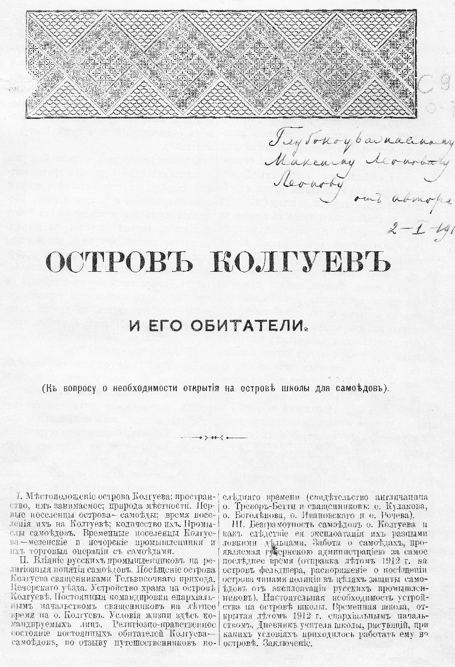 Козмин, Николай Дмитриевич. Остров Колгуев и его обитатели : (к вопросу о необходимости открытия на острове школы для самоедов) / Николай Козмин. – Санкт-Петербург, [1913]. далее Крестинин, Василий Васильевич. Вопросы и ответы, касательные до самоедов / [В. В. Крестинин] // Новые ежемесячные сочинения. – 1787. – Ч. 9 (март). – С. 3 – 30. далее Крестинин, Василий Васильевич. Вопросы и ответы, вообще касательные как до ... самоедов // Новые ежемесячные сочинения. – 1787. – Ч. 8 (февр.). – С. 9 – 28. далее |