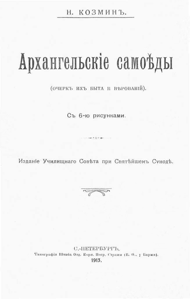 Козмин, Николай Дмитриевич. Архангельские самоеды : (Очерк их быта и верований) : С 6-ю рисунками / Н. Козмин. – Санкт-Петербург : Изд. Училищ. совета при Святейшем Синоде, 1913.Тематические группировки