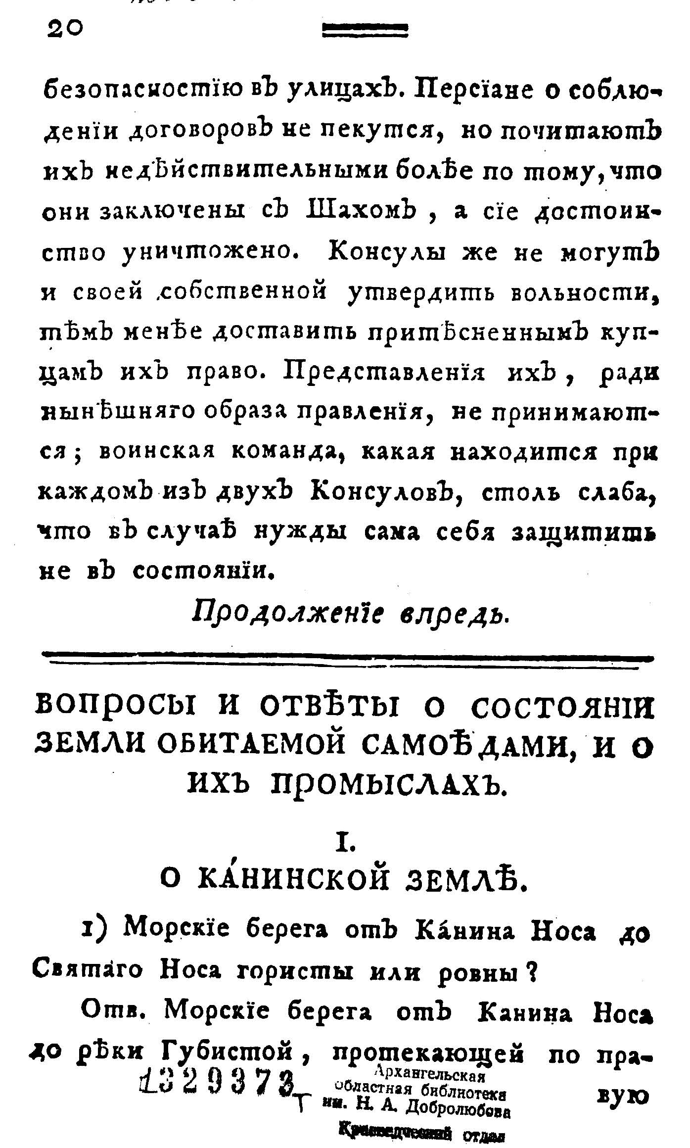 Крестинин, Василий Васильевич. Вопросы и ответы, вообще касательные как до ... самоедов // Новые ежемесячные сочинения. – 1787. – Ч. 8 (февр.). – С. 9 – 28. далее