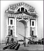 Начало грандиозного строительства состоялось два года ранее 9 июля 1811 г. «при громе орудий» и было освящено уже упомянутым нами епископом Вениамином. В строение были вложены две закладные доски, которые до наших дней не сохранились. На одной из них перечислялись имена инициаторов постройки, а другая содержала информацию о том, что триумфальная арка заложена в честь 10-летия «всерадостнейшего дня восшествия на высочайший престол Государя Императора Александра I-го». Архитектором ворот, выполненных в стиле «ампир» и ставших своеобразной визитной карточкой города, стал иркутский губернский архитектор Я. А. Кругликов. Теперь путника, переправившегося через Ангару на плашкоуте, Иркутск приветствовал красотой величественной архитектуры. В помещениях ворот в разное время располагались станция общества спасения на водах и городской архив. Среди горожан бытовали различные легенды, рассказывающие о создании Московских ворот. Так, по одной из версий считалось, что ворота были выстроены в 1812 г. для торжественной встречи либо Наполеона, либо императора Александра I в зависимости от того, кто из них будет царствовать по окончании Отечественной войны. Другая легенда попала на страницы газеты «Сибирь» в 1909 г., откуда мы узнаём, что «по преданию, имеющему под собой, по мнению некоторых членов местной архивной комиссии, исторические основания – в начале 19 ст.[олетия], начиная с 1801 г., конный и рогатый скот в Иркутской губернии был истреблён моровой язвой, после которой редко у кого из местных жителей можно было встретить лошадь или корову. Около 1810–11 гг. мор прекратился, в ознаменование чего, как гласит то же предание, и были построены Московские ворота. Этим обстоятельством и объясняются лепные рисунки головы быка в кругу, сохранившемся до сих пор на фронтоне ворот. На другой стороне их, обращённой к городу, имелись изображения гербов всех окружных городов Иркутской губернии, но от этих гербов теперь не осталось и следа»… С течением времени ворота значительно обветшали и уже не имели «триумфального» вида. На заседаниях Иркутской городской думы всё чаще стал звучать вопрос об их капитальном ремонте либо полном разборе в связи с «угрозой падения». В городе создавались различные комиссии для официального освидетельствования здания. Так 13 июля 1905 г. при осмотре Московских ворот было принято решение об их восстановлении, «не нарушая типичность ея архитектуры, как памятника», однако капитальный ремонт так и не был произведён. В 1922 г. при осмотре комиссией всё же было решено разобрать ворота, сохранив при этом все детали, а затем на том же месте вновь восстановить их точную копию. Активные дискуссии о судьбе ворот отражала и иркутская пресса. Так, например, в 1909 г. в газете «Сибирь» горожанам сообщалось, что «иркутское губернское управление обратилось в здешний отдел географического общества с запросом, имеют ли московские ворота какое-либо значение, как памятник древности, и следует ли их оберегать на основании существующих узаконений?». Отдел географического общества ответил на этот вопрос утвердительно. В этом же году газеты вновь сообщают о том, что делопроизводитель городской управы П. Н. Колотилов, обращаясь к городскому голове с докладной запиской, сообщил, что, занимаясь уже несколько лет изучением истории Сибири и, в частности, Иркут